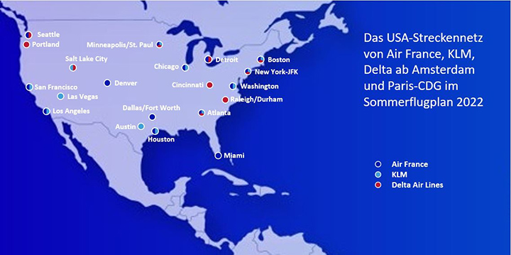 Für den Sommerflugplan stehen nun viele weitere Verbindungen auf dem Plan. Es sollen ganze 20 US-Destinationen angeflogen werden, und zwar ab Paris-CDG und Paris-Orly bzw. Amsterdam. Sie viele Ziele in den Vereinigten Staaten haben die drei Airlines noch nie ab Europa bedient. Aus Deutschland haben Reisende Anschluss von diversen Flughäfen, acht sind es bei Air France und zehn im Falle von KLM. Diese Grafik gibt einen guten Überblick über die Verbindungen ab dem Sommer 2022: