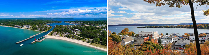 Petoskey, im Bild oben rechts zu sehen, war zu Zeiten des frühen 20. Jahrhunderts einer der beliebtesten Sommer-Ferienorte für die Reichen und Schönen des Mittleren Westens. Auch Ernest Hemingway verbrachte viele Sommer in der hübschen Kleinstadt und in ihrer Umgebung. Eine ganz besondere Führung kann man noch heute durch den legendären City Park Grill unternehmen, in dem Hemingway das ein oder andere Bier trank. Besondere und individuelle Geschäfte und Boutiquen machen Petoskey zu einem Shoppingparadies. Nördlich der Stadt schließen sich die mondänen Orte Bay View und Harbor Springs (weiße Strände und türkisblaues Wasser) an. Zudem finden sich dort mit den Boyne Highlands einige der höchsten Erhebungen Michigans.