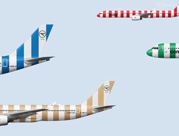 Alles, was gut ist und an Urlaub erinnert, ist gestreift - seien es die Badetücher, die Sonnenschirme, Wasserbälle oder Eisdielenmarkisen. Außerdem stehen die bunten Streifen für Vielfalt, und die ist Condor besonders wichtig. Jeder ist hier willkommen. In welchem Flieger werden Sie wohl demnächt sitzen? In Sunshine, Passion, Sea, Island oder Beach?